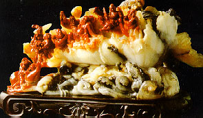 Fuzhou Stone Carving Factory is located on June 1st Road in Fuzhou. It produces more than 1,000 different items known by the brand name Shoushan Stone Carving. The stone used is only quarried in the nearby village of Shoushan and is noted for its fine texture and transparent color. The most valuable type of stone used is called Tianhuang Stone or King Stone, which is said to be more expensive than gold. Shoushan Stone Carving has been produced for more than 1,500 years.