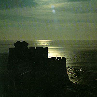 A large stone carving of a dragon's head once overlooked the seas, but today a small fortress and 2 story temple stands at the end of the much repaired wall.