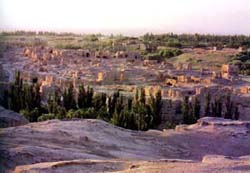 The Ancient City of Jiaohe is 10km (6 miles) west of Turpan in the Yarnaz Valley. Jiaohe means "intersecting rivers" and the ruins are located on top of a 30 meter (98ft) cliff carved out by 2 long dried up rivers. 2000 years ago, Jiaohe was powerful and important - it was the capital of the state of South Cheshi, one of the kingdoms of the Han dynasty (206-220BC) and was eventually incorporated into the Uighur empire in the 9th century BC. The city was at its cultural peak under the Uighurs, but Mongol rebellions led to its demise and by the Yuan dynasty (1280-1368AD) Jiaohe was deserted.